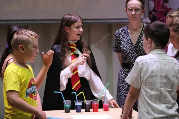 Сегодня РДК на несколько часов превратился в замок чародейства и волшебства Хогвартс. Наши юные артисты, перевоплотившись в известных героев книг Джоан Роулинг, провели маленьких зрителей клуба "Планета детства", а также участников летнего лагеря СОШ №2 по сказочному миру друзей-волшебников Гарри, Рона, Гермионы и Полумны. Вместе с главными героями ребята прошли через различные испытания: искали на квиддичном поле золотой снитч, угадывали зелья в кабинете зельеварения, побеждали дракона, отгадывали загадки Полной дамы и т.д. А главное - спасли время и вернули веру в волшебство всем детям. Мы очень рады, что благодаря нашим игровым программам дети узнают много нового и интересного, открывают в себе желание читать книги.
